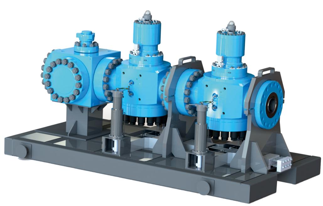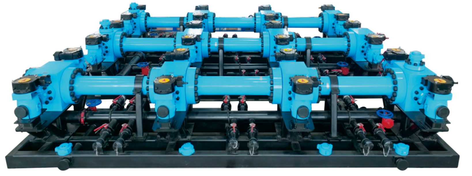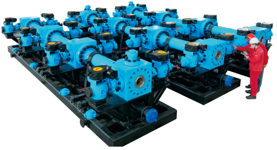 -法兰式一般用于页岩气、页岩油压裂,排量12-20m³/min。-压力等级105Mpa和140Mpa。-接口数量:由壬式一般最多12口,法兰式一般可以实现多撬装组合至24口